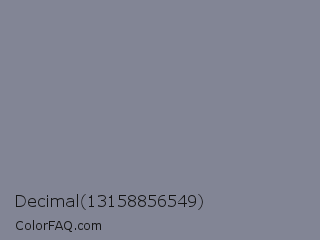 Decimal 13158856549 Color is a normal blue color and the nearest color is Roman Silver #838996. Hex code #828595 and RGB value is rgb(130,133,149). In RGB color space, this color is composed of 51% red, 52% green, 58% blue, In CMYK color space, this color is composed of 13% cyan, 11% magenta, 0% yellow , 42% black , In HSL color space, this color has a hue angle of 231° , 8% saturation and 55% lightness.