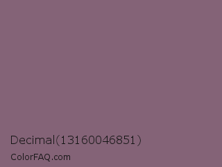 Decimal 13160046851 Color is a normal magenta color and the nearest color is Falcon #7f626d. Hex code #846377 and RGB value is rgb(132,99,119). In RGB color space, this color is composed of 52% red, 39% green, 47% blue, In CMYK color space, this color is composed of 0% cyan, 25% magenta, 10% yellow , 48% black , In HSL color space, this color has a hue angle of 324° , 14% saturation and 45% lightness.