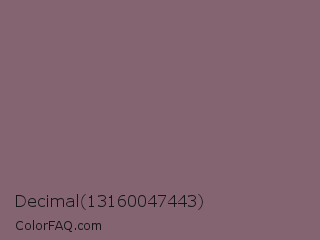 Decimal 13160047443 Color is a normal rose color and the nearest color is Falcon #7f626d. Hex code #846471 and RGB value is rgb(132,100,113). In RGB color space, this color is composed of 52% red, 39% green, 44% blue, In CMYK color space, this color is composed of 0% cyan, 24% magenta, 14% yellow , 48% black , In HSL color space, this color has a hue angle of 336° , 14% saturation and 45% lightness.