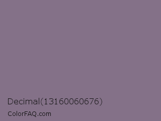 Decimal 13160060676 Color is a normal purple color and the nearest color is Mobster #7f7589. Hex code #847188 and RGB value is rgb(132,113,136). In RGB color space, this color is composed of 52% red, 44% green, 53% blue, In CMYK color space, this color is composed of 3% cyan, 17% magenta, 0% yellow , 47% black , In HSL color space, this color has a hue angle of 290° , 9% saturation and 49% lightness.