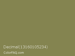 Decimal 13160105234 Color is a normal yellow color and the nearest color is Dark Tan #918151. Hex code #848450 and RGB value is rgb(132,132,80). In RGB color space, this color is composed of 52% red, 52% green, 31% blue, In CMYK color space, this color is composed of 0% cyan, 0% magenta, 39% yellow , 48% black , In HSL color space, this color has a hue angle of 60° , 25% saturation and 42% lightness.