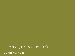 Decimal 13160106392 Color is a normal yellow color and the nearest color is Old Moss Green #867e36. Hex code #848636 and RGB value is rgb(132,134,54). In RGB color space, this color is composed of 52% red, 53% green, 21% blue, In CMYK color space, this color is composed of 1% cyan, 0% magenta, 60% yellow , 47% black , In HSL color space, this color has a hue angle of 62° , 43% saturation and 37% lightness.