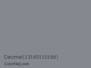 Decimal 13160110166 Color is a normal blue color and the nearest color is Oslo Gray #878d91. Hex code #848990 and RGB value is rgb(132,137,144). In RGB color space, this color is composed of 52% red, 54% green, 56% blue, In CMYK color space, this color is composed of 8% cyan, 5% magenta, 0% yellow , 44% black , In HSL color space, this color has a hue angle of 215° , 5% saturation and 54% lightness.