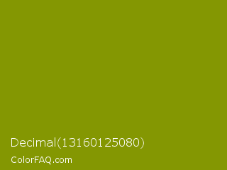 Decimal 13160125080 Color is a dark yellow color and the nearest color is Limeade #6f9d02. Hex code #849702 and RGB value is rgb(132,151,2). In RGB color space, this color is composed of 52% red, 59% green, 1% blue, In CMYK color space, this color is composed of 13% cyan, 0% magenta, 99% yellow , 41% black , In HSL color space, this color has a hue angle of 68° , 97% saturation and 30% lightness.