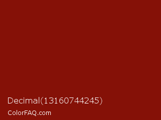 Decimal 13160744245 Color is a dark red color and the nearest color is Barn Red #7c0a02. Hex code #851107 and RGB value is rgb(133,17,7). In RGB color space, this color is composed of 52% red, 7% green, 3% blue, In CMYK color space, this color is composed of 0% cyan, 87% magenta, 95% yellow , 48% black , In HSL color space, this color has a hue angle of 5° , 90% saturation and 27% lightness.
