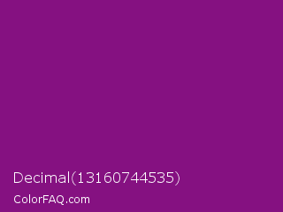 Decimal 13160744535 Color is a dark magenta color and the nearest color is Mardi Gras #880085. Hex code #851181 and RGB value is rgb(133,17,129). In RGB color space, this color is composed of 52% red, 7% green, 51% blue, In CMYK color space, this color is composed of 0% cyan, 87% magenta, 3% yellow , 48% black , In HSL color space, this color has a hue angle of 302° , 77% saturation and 29% lightness.