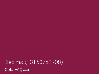 Decimal 13160752708 Color is a normal rose color and the nearest color is Disco #871550. Hex code #851944 and RGB value is rgb(133,25,68). In RGB color space, this color is composed of 52% red, 10% green, 27% blue, In CMYK color space, this color is composed of 0% cyan, 81% magenta, 49% yellow , 48% black , In HSL color space, this color has a hue angle of 336° , 68% saturation and 31% lightness.