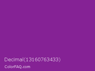 Decimal 13160763433 Color is a normal magenta color and the nearest color is Seance #731e8f. Hex code #852295 and RGB value is rgb(133,34,149). In RGB color space, this color is composed of 52% red, 13% green, 58% blue, In CMYK color space, this color is composed of 11% cyan, 77% magenta, 0% yellow , 42% black , In HSL color space, this color has a hue angle of 292° , 63% saturation and 36% lightness.