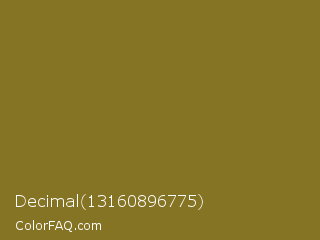 Decimal 13160896775 Color is a normal yellow color and the nearest color is Spanish Bistre #807532. Hex code #857423 and RGB value is rgb(133,116,35). In RGB color space, this color is composed of 52% red, 45% green, 14% blue, In CMYK color space, this color is composed of 0% cyan, 13% magenta, 74% yellow , 48% black , In HSL color space, this color has a hue angle of 50° , 58% saturation and 33% lightness.