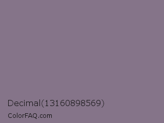 Decimal 13160898569 Color is a normal purple color and the nearest color is Mobster #7f7589. Hex code #857489 and RGB value is rgb(133,116,137). In RGB color space, this color is composed of 52% red, 45% green, 54% blue, In CMYK color space, this color is composed of 3% cyan, 15% magenta, 0% yellow , 46% black , In HSL color space, this color has a hue angle of 289° , 8% saturation and 50% lightness.