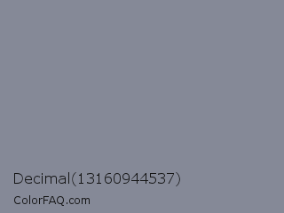 Decimal 13160944537 Color is a normal blue color and the nearest color is Roman Silver #838996. Hex code #858997 and RGB value is rgb(133,137,151). In RGB color space, this color is composed of 52% red, 54% green, 59% blue, In CMYK color space, this color is composed of 12% cyan, 9% magenta, 0% yellow , 41% black , In HSL color space, this color has a hue angle of 227° , 8% saturation and 56% lightness.
