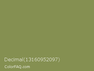 Decimal 13160952097 Color is a normal yellow color and the nearest color is Moss Green #8a9a5b. Hex code #859051 and RGB value is rgb(133,144,81). In RGB color space, this color is composed of 52% red, 56% green, 32% blue, In CMYK color space, this color is composed of 8% cyan, 0% magenta, 44% yellow , 44% black , In HSL color space, this color has a hue angle of 70° , 28% saturation and 44% lightness.