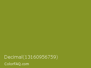 Decimal 13160956759 Color is a normal yellow color and the nearest color is Wasabi #788a25. Hex code #859525 and RGB value is rgb(133,149,37). In RGB color space, this color is composed of 52% red, 58% green, 15% blue, In CMYK color space, this color is composed of 11% cyan, 0% magenta, 75% yellow , 42% black , In HSL color space, this color has a hue angle of 69° , 60% saturation and 36% lightness.