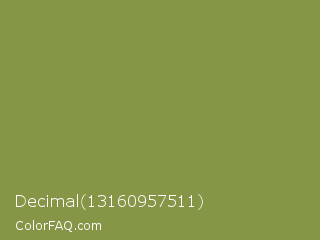 Decimal 13160957511 Color is a normal lime color and the nearest color is Sycamore #908d39. Hex code #859647 and RGB value is rgb(133,150,71). In RGB color space, this color is composed of 52% red, 59% green, 28% blue, In CMYK color space, this color is composed of 11% cyan, 0% magenta, 53% yellow , 41% black , In HSL color space, this color has a hue angle of 73° , 36% saturation and 43% lightness.