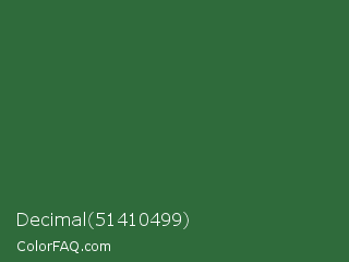 Decimal 51410499 Color is a dark green color and the nearest color is Hunter Green #355e3b. Hex code #2f6b3b and RGB value is rgb(47,107,59). In RGB color space, this color is composed of 18% red, 42% green, 23% blue, In CMYK color space, this color is composed of 56% cyan, 0% magenta, 45% yellow , 58% black , In HSL color space, this color has a hue angle of 132° , 39% saturation and 30% lightness.