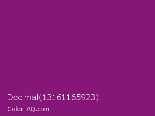 Decimal 13161165923 Color is a normal magenta color and the nearest color is Patriarch #800080. Hex code #861677 and RGB value is rgb(134,22,119). In RGB color space, this color is composed of 53% red, 9% green, 47% blue, In CMYK color space, this color is composed of 0% cyan, 84% magenta, 11% yellow , 47% black , In HSL color space, this color has a hue angle of 308° , 72% saturation and 31% lightness.