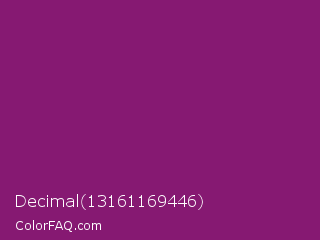 Decimal 13161169446 Color is a normal magenta color and the nearest color is Razzmic Berry Crayola #843179. Hex code #861972 and RGB value is rgb(134,25,114). In RGB color space, this color is composed of 53% red, 10% green, 45% blue, In CMYK color space, this color is composed of 0% cyan, 81% magenta, 15% yellow , 47% black , In HSL color space, this color has a hue angle of 311° , 69% saturation and 31% lightness.