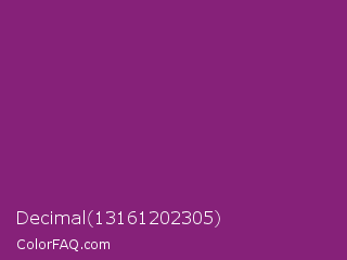 Decimal 13161202305 Color is a normal magenta color and the nearest color is Razzmic Berry Crayola #843179. Hex code #862179 and RGB value is rgb(134,33,121). In RGB color space, this color is composed of 53% red, 13% green, 47% blue, In CMYK color space, this color is composed of 0% cyan, 75% magenta, 10% yellow , 47% black , In HSL color space, this color has a hue angle of 308° , 60% saturation and 33% lightness.