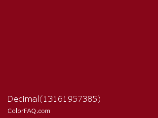 Decimal 13161957385 Color is a dark red color and the nearest color is Pohutukawa #8f021c. Hex code #870619 and RGB value is rgb(135,6,25). In RGB color space, this color is composed of 53% red, 2% green, 10% blue, In CMYK color space, this color is composed of 0% cyan, 96% magenta, 81% yellow , 47% black , In HSL color space, this color has a hue angle of 351° , 91% saturation and 28% lightness.