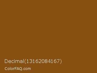 Decimal 13162084167 Color is a dark orange color and the nearest color is Grizzly #885818. Hex code #875013 and RGB value is rgb(135,80,19). In RGB color space, this color is composed of 53% red, 31% green, 7% blue, In CMYK color space, this color is composed of 0% cyan, 41% magenta, 86% yellow , 47% black , In HSL color space, this color has a hue angle of 32° , 75% saturation and 30% lightness.
