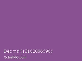 Decimal 13162086696 Color is a normal purple color and the nearest color is Razzmic Berry #8d4e85. Hex code #875190 and RGB value is rgb(135,81,144). In RGB color space, this color is composed of 53% red, 32% green, 56% blue, In CMYK color space, this color is composed of 6% cyan, 44% magenta, 0% yellow , 44% black , In HSL color space, this color has a hue angle of 291° , 28% saturation and 44% lightness.