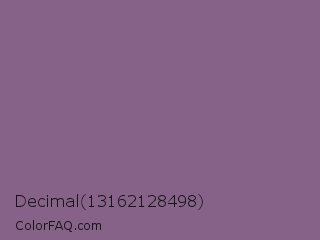 Decimal 13162128498 Color is a normal magenta color and the nearest color is Chinese Violet #856088. Hex code #876288 and RGB value is rgb(135,98,136). In RGB color space, this color is composed of 53% red, 38% green, 53% blue, In CMYK color space, this color is composed of 1% cyan, 28% magenta, 0% yellow , 47% black , In HSL color space, this color has a hue angle of 298° , 16% saturation and 46% lightness.