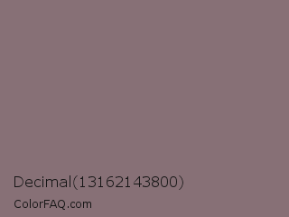 Decimal 13162143800 Color is a normal rose color and the nearest color is Empress #817377. Hex code #877076 and RGB value is rgb(135,112,118). In RGB color space, this color is composed of 53% red, 44% green, 46% blue, In CMYK color space, this color is composed of 0% cyan, 17% magenta, 13% yellow , 47% black , In HSL color space, this color has a hue angle of 344° , 9% saturation and 48% lightness.