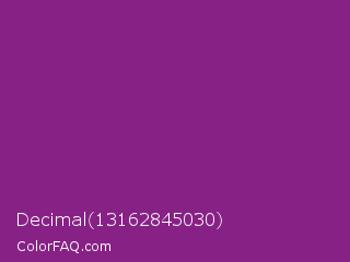Decimal 13162845030 Color is a normal magenta color and the nearest color is Razzmic Berry Crayola #843179. Hex code #882186 and RGB value is rgb(136,33,134). In RGB color space, this color is composed of 53% red, 13% green, 53% blue, In CMYK color space, this color is composed of 0% cyan, 76% magenta, 1% yellow , 47% black , In HSL color space, this color has a hue angle of 301° , 61% saturation and 33% lightness.