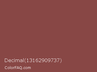 Decimal 13162909737 Color is a normal red color and the nearest color is Cordovan #893f45. Hex code #884745 and RGB value is rgb(136,71,69). In RGB color space, this color is composed of 53% red, 28% green, 27% blue, In CMYK color space, this color is composed of 0% cyan, 48% magenta, 49% yellow , 47% black , In HSL color space, this color has a hue angle of 2° , 33% saturation and 40% lightness.