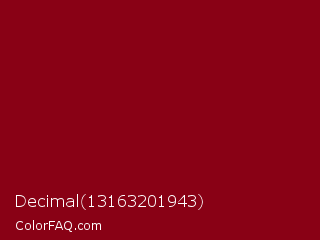 Decimal 13163201943 Color is a dark red color and the nearest color is Red Devil #860111. Hex code #890115 and RGB value is rgb(137,1,21). In RGB color space, this color is composed of 54% red, 0% green, 8% blue, In CMYK color space, this color is composed of 0% cyan, 99% magenta, 85% yellow , 46% black , In HSL color space, this color has a hue angle of 351° , 99% saturation and 27% lightness.