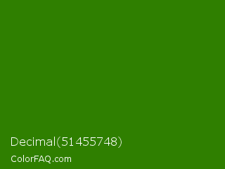 Decimal 51455748 Color is a dark green color and the nearest color is Napier Green #2a8000. Hex code #2f7f00 and RGB value is rgb(47,127,0). In RGB color space, this color is composed of 18% red, 50% green, 0% blue, In CMYK color space, this color is composed of 63% cyan, 0% magenta, 100% yellow , 50% black , In HSL color space, this color has a hue angle of 98° , 100% saturation and 25% lightness.