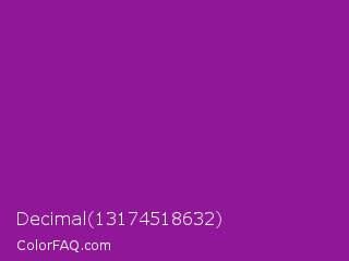 Decimal 13174518632 Color is a normal magenta color and the nearest color is Violet Eggplant #991199. Hex code #901898 and RGB value is rgb(144,24,152). In RGB color space, this color is composed of 56% red, 9% green, 60% blue, In CMYK color space, this color is composed of 5% cyan, 84% magenta, 0% yellow , 40% black , In HSL color space, this color has a hue angle of 296° , 73% saturation and 35% lightness.