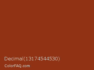 Decimal 13174544530 Color is a normal color and the nearest color is Kobe #882d17. Hex code #903214 and RGB value is rgb(144,50,20). In RGB color space, this color is composed of 56% red, 20% green, 8% blue, In CMYK color space, this color is composed of 0% cyan, 65% magenta, 86% yellow , 44% black , In HSL color space, this color has a hue angle of 15° , 76% saturation and 32% lightness.