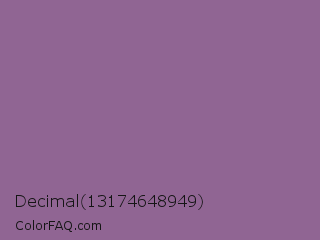 Decimal 13174648949 Color is a normal magenta color and the nearest color is Trendy Pink #8c6495. Hex code #906593 and RGB value is rgb(144,101,147). In RGB color space, this color is composed of 56% red, 40% green, 58% blue, In CMYK color space, this color is composed of 2% cyan, 31% magenta, 0% yellow , 42% black , In HSL color space, this color has a hue angle of 296° , 19% saturation and 49% lightness.