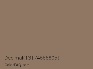Decimal 13174666805 Color is a normal orange color and the nearest color is Cement #8d7662. Hex code #907763 and RGB value is rgb(144,119,99). In RGB color space, this color is composed of 56% red, 47% green, 39% blue, In CMYK color space, this color is composed of 0% cyan, 17% magenta, 31% yellow , 44% black , In HSL color space, this color has a hue angle of 27° , 19% saturation and 48% lightness.