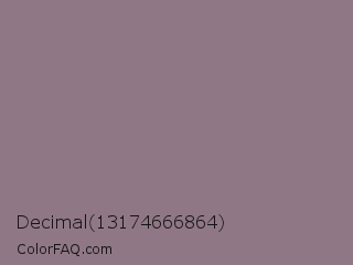 Decimal 13174666864 Color is a normal magenta color and the nearest color is Rocket Metallic #8a7f80. Hex code #907786 and RGB value is rgb(144,119,134). In RGB color space, this color is composed of 56% red, 47% green, 53% blue, In CMYK color space, this color is composed of 0% cyan, 17% magenta, 7% yellow , 44% black , In HSL color space, this color has a hue angle of 324° , 10% saturation and 52% lightness.