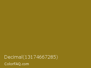 Decimal 13174667285 Color is a normal yellow color and the nearest color is Sand Dune #967117. Hex code #907817 and RGB value is rgb(144,120,23). In RGB color space, this color is composed of 56% red, 47% green, 9% blue, In CMYK color space, this color is composed of 0% cyan, 17% magenta, 84% yellow , 44% black , In HSL color space, this color has a hue angle of 48° , 72% saturation and 33% lightness.