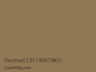 Decimal 13174667383 Color is a normal orange color and the nearest color is Pale Brown #987654. Hex code #907855 and RGB value is rgb(144,120,85). In RGB color space, this color is composed of 56% red, 47% green, 33% blue, In CMYK color space, this color is composed of 0% cyan, 17% magenta, 41% yellow , 44% black , In HSL color space, this color has a hue angle of 36° , 26% saturation and 45% lightness.