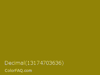 Decimal 13174703636 Color is a dark yellow color and the nearest color is Dark Yellow #9b870c. Hex code #908306 and RGB value is rgb(144,131,6). In RGB color space, this color is composed of 56% red, 51% green, 2% blue, In CMYK color space, this color is composed of 0% cyan, 9% magenta, 96% yellow , 44% black , In HSL color space, this color has a hue angle of 54° , 92% saturation and 29% lightness.