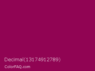 Decimal 13174912789 Color is a dark magenta color and the nearest color is Cardinal Pink #8c055e. Hex code #910453 and RGB value is rgb(145,4,83). In RGB color space, this color is composed of 57% red, 2% green, 33% blue, In CMYK color space, this color is composed of 0% cyan, 97% magenta, 43% yellow , 43% black , In HSL color space, this color has a hue angle of 326° , 95% saturation and 29% lightness.