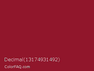 Decimal 13174931492 Color is a normal red color and the nearest color is Old Brick #901e1e. Hex code #911528 and RGB value is rgb(145,21,40). In RGB color space, this color is composed of 57% red, 8% green, 16% blue, In CMYK color space, this color is composed of 0% cyan, 86% magenta, 72% yellow , 43% black , In HSL color space, this color has a hue angle of 351° , 75% saturation and 33% lightness.