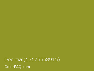 Decimal 13175558915 Color is a normal yellow color and the nearest color is Sycamore #908d39. Hex code #919727 and RGB value is rgb(145,151,39). In RGB color space, this color is composed of 57% red, 59% green, 15% blue, In CMYK color space, this color is composed of 4% cyan, 0% magenta, 74% yellow , 41% black , In HSL color space, this color has a hue angle of 63° , 59% saturation and 37% lightness.