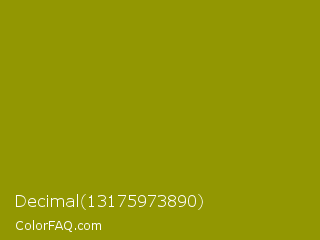 Decimal 13175973890 Color is a dark yellow color and the nearest color is Dark Yellow #9b870c. Hex code #929702 and RGB value is rgb(146,151,2). In RGB color space, this color is composed of 57% red, 59% green, 1% blue, In CMYK color space, this color is composed of 3% cyan, 0% magenta, 99% yellow , 41% black , In HSL color space, this color has a hue angle of 62° , 97% saturation and 30% lightness.