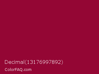 Decimal 13176997892 Color is a dark rose color and the nearest color is Pink Raspberry #980036. Hex code #940634 and RGB value is rgb(148,6,52). In RGB color space, this color is composed of 58% red, 2% green, 20% blue, In CMYK color space, this color is composed of 0% cyan, 96% magenta, 65% yellow , 42% black , In HSL color space, this color has a hue angle of 341° , 92% saturation and 30% lightness.