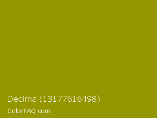 Decimal 13177616498 Color is a dark yellow color and the nearest color is Dark Yellow #9b870c. Hex code #949700 and RGB value is rgb(148,151,0). In RGB color space, this color is composed of 58% red, 59% green, 0% blue, In CMYK color space, this color is composed of 2% cyan, 0% magenta, 100% yellow , 41% black , In HSL color space, this color has a hue angle of 61° , 100% saturation and 30% lightness.