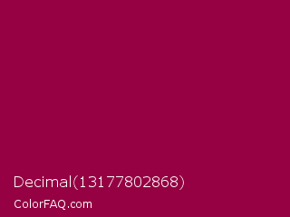 Decimal 13177802868 Color is a dark rose color and the nearest color is Pink Raspberry #980036. Hex code #950142 and RGB value is rgb(149,1,66). In RGB color space, this color is composed of 58% red, 0% green, 26% blue, In CMYK color space, this color is composed of 0% cyan, 99% magenta, 56% yellow , 42% black , In HSL color space, this color has a hue angle of 334° , 99% saturation and 29% lightness.