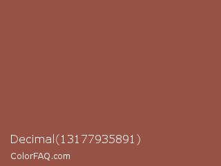 Decimal 13177935891 Color is a normal red color and the nearest color is Coconut #965a3e. Hex code #955245 and RGB value is rgb(149,82,69). In RGB color space, this color is composed of 58% red, 32% green, 27% blue, In CMYK color space, this color is composed of 0% cyan, 45% magenta, 54% yellow , 42% black , In HSL color space, this color has a hue angle of 10° , 37% saturation and 43% lightness.