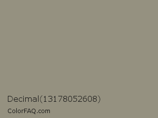 Decimal 13178052608 Color is a normal yellow color and the nearest color is Pale Oyster #988d77. Hex code #959180 and RGB value is rgb(149,145,128). In RGB color space, this color is composed of 58% red, 57% green, 50% blue, In CMYK color space, this color is composed of 0% cyan, 3% magenta, 14% yellow , 42% black , In HSL color space, this color has a hue angle of 49° , 9% saturation and 54% lightness.