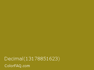 Decimal 13178851623 Color is a normal yellow color and the nearest color is Hacienda #98811b. Hex code #968817 and RGB value is rgb(150,136,23). In RGB color space, this color is composed of 59% red, 53% green, 9% blue, In CMYK color space, this color is composed of 0% cyan, 9% magenta, 85% yellow , 41% black , In HSL color space, this color has a hue angle of 53° , 73% saturation and 34% lightness.