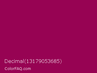 Decimal 13179053685 Color is a dark rose color and the nearest color is Cardinal Pink #8c055e. Hex code #970353 and RGB value is rgb(151,3,83). In RGB color space, this color is composed of 59% red, 1% green, 33% blue, In CMYK color space, this color is composed of 0% cyan, 98% magenta, 45% yellow , 41% black , In HSL color space, this color has a hue angle of 328° , 96% saturation and 30% lightness.